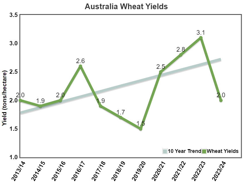 In Australië werkt het weer evengoed niet mee voor graantelers Het groeiseizoen verliep warm en droog tot donderbuien eind november roet in het eten gooiden. De regen laat in het seizoen heeft vooral in koolzaad en linzen voor schade gezorgd, maar ook de kwaliteit van tarwe is er niet beter op geworden. De voortgang van de graanoogst gaat met gezwinde spoed. Lokale bronnen melden dat in de provincie Zuid-Australië de graanoogst er zo goed als opzit. Het komt niet vaak voor dat telers voor de kerst klaar zijn met dorsen. De opbrengsten liggen rond of net iets boven het meerjarige gemiddelde, volgens verschillende berichten. Het USDA ging in de laatste voorspelling uit van een gemiddelde tarweopbrengst van twee ton per hectare in Australië. Dat is een derde minder dan vorige seizoen toen een recordoogst werd binnen gehaald.