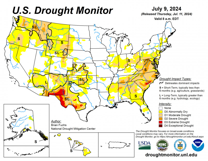 Droger maar vooral warmer weer is opkomst in de VS. Hitte zou voor stress kunnen zorgen, maar water is voor de verandering na jaren met vooral droogte geen probleem. Een groot deel van de Midwest is ook deze week niet ingekleurd op de droogtemonitor.