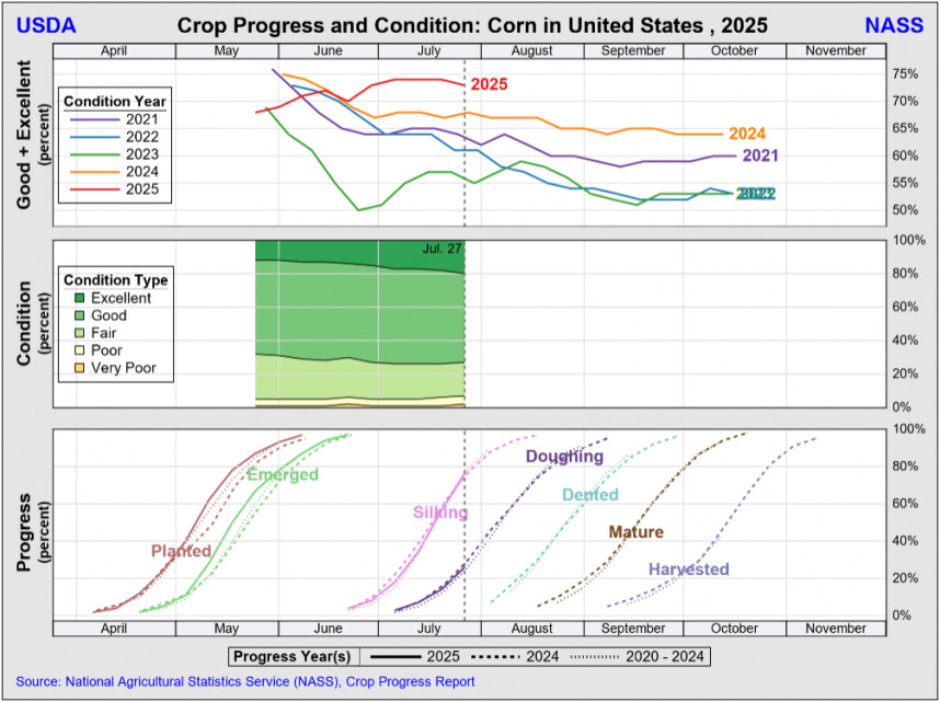 Een top jaar voor tarwe is het misschien niet voor telers in Amerika, maar de maïs doet het er uitstekend. 73% van het areaal staat er goed of excellent op volgens het USDA. Qua groei loopt de maïs redelijk in de pas met het meerjarig gemiddelde. Met in de pluim komen loopt het iets achter op gemiddeld, maar met korrelvulling juist iets voor.