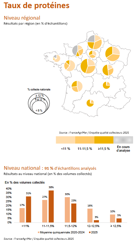 In Frankrijk zijn de cijfers over de kwaliteit van de tarwe wisselend. Het eiwitgehalte in de zachte tarwe is aan de lage kant. 69% van de tarwe in Frankrijk haalt de 11% eiwit of meer. Het vijfjarig gemiddelde zit op 83% van tarwe met een eiwitgehalte van 11% of meer, zo blijkt uit de cijfers van FranceAgriMer. Het hectolitergewicht is dan weer weer dik in orde. 93% van de tarwe heeft een hectolitergewicht van 76 of hoger tegen 62% in het vijfjarig gemiddelde. Hoewel FranceAgriMer er niet op ingaat, zou dat weleens te maken kunnen hebben met de droogte tijdens de korrelvulling. Het gewas heeft daardoor geen stikstof opgenomen en dat komt terug in het eiwitgehalte.