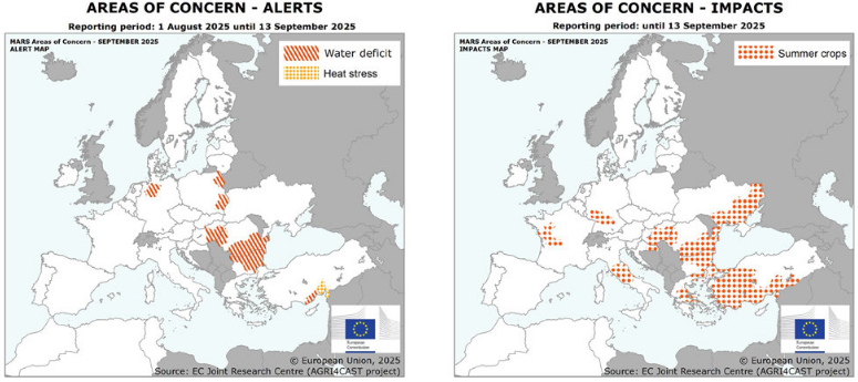 In Europa kwam het JRC, het wetenschappelijk bureau van de Europese Commissie met de septembereditie van het Mars Bulletin. Vooral in het zuiden en het oosten van Europa zijn er nog steeds problemen met droogte. Menig aardappelteler in het zuiden van Nederland of België zal zich hier niet helemaal in herkennen, maar alleen een stukje Frankrijk en het zuiden van Duitsland worden naast het zuidoosten van Europa aangemerkt als 'areas of concern' in het Mars Bulletin.