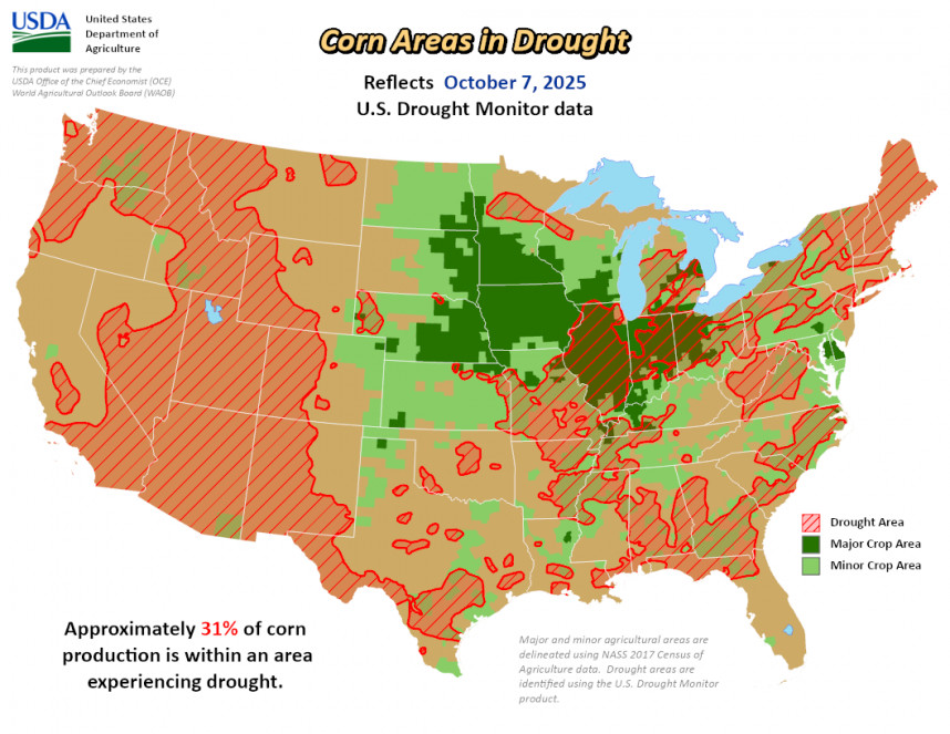 De droogtemonitor is deze week wel uitgekomen. Daarin valt te zien dat de droogte op de cornbelt zich uitbreidt. Van het areaal maïs in de VS staat 31% nu in een droogtegebied tegen 28% vorige week. Voor de oogst van maïs en soja is het droge weer prettig, maar de gewassen die nog niet rijp waren worden wel noodrijp, zo schrijven verschillende lokale bronnen.