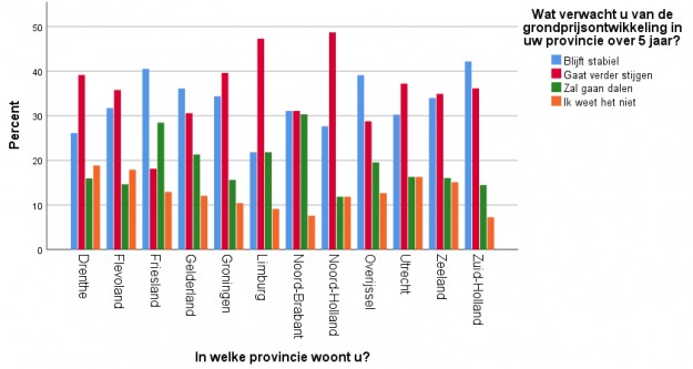 Dat de boeren Noord-Brabant en Friesland denken dat de grondprijs gaat dalen, is niet verwonderlijk. Dit zijn namelijk de provincies waar over het algemeen meer aanbod is van grond en minder vraag (vergeleken met de provincie Noord-Holland). Behalve de boeren in Noord-Holland verwacht ook een opvallend groot gedeelte van de boeren in Limburg, Groningen en Drenthe dat de grondprijs gaat stijgen.