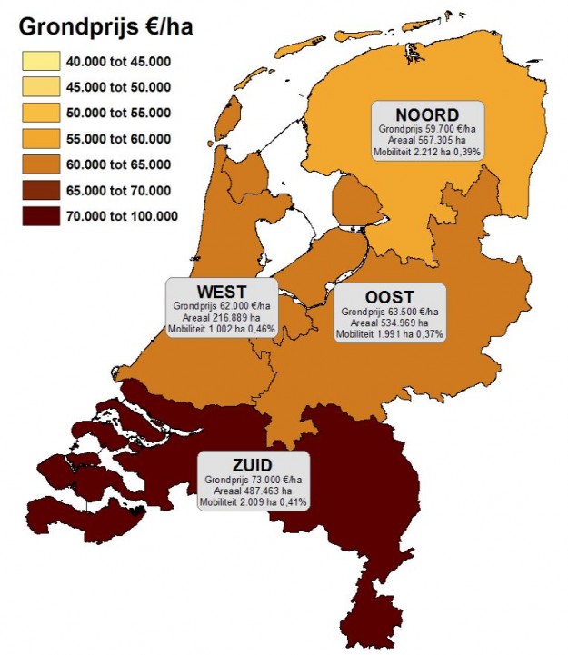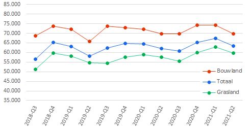 De prijs van bouwland daalde met 6% ten opzichte van het 1e kwartaal en komt uit op €69.800 per hectare. De gemiddelde prijs over 2020 kwam uit op €71.800 per hectare. Grasland is 5% in waarde gezakt in vergelijking met het 1e kwartaal en kostte in het 2e kwartaal gemiddeld €59.600 per hectare. Daarmee blijft de grondprijs nog wel 2% boven het gemiddelde over heel 2020 van €58.400 per hectare. De prijs van snijmaïsland is met €66.800 per hectare vrijwel gelijk gebleven aan het vorige kwartaal.