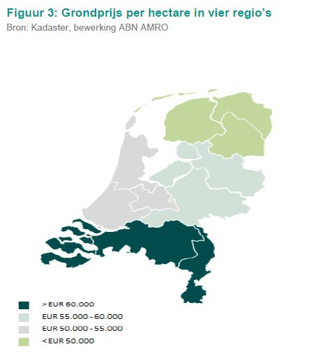 'Hoge prijzen voor landbouwgrond werken immers prijsverhogend en drukken daarmee op het rendement van de ondernemers', zo meldt ABN Amro in de sector update over landbouwgrond. De bank maakt daarmee duidelijk waarom grondprijzen niet kunnen blijven stijgen in het tempo van de laatste jaren.