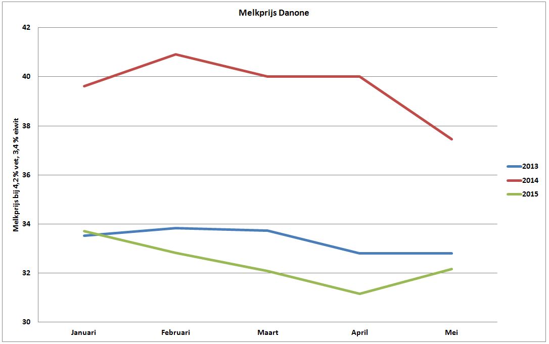 Hoe heeft de melkprijs van Danone zich over de eerste vijf maanden van 2015 ontwikkeld?