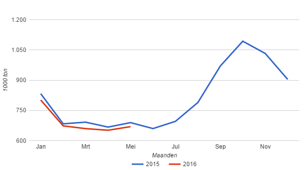 De totale melkproductie over mei komt uit 669.400 ton, dit is een daling van ruim 5.5 procent ten opzichte van de productie in mei vorig jaar. Al sinds september ligt de melkaanvoer elke maand onder het niveau van 2015. De daling van mei dit jaar is echter het sterkst.
