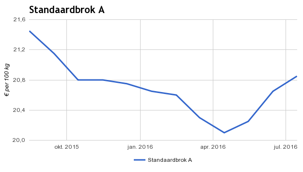 Het meest bescheiden is de stijging van de prijs van standaardbrok. Die pakt door tot 20,85 euro per 100 kg brok. Toch is dit ook voldoende om de prijs door te laten pakken naar het hoogste niveau sinds september 2015.