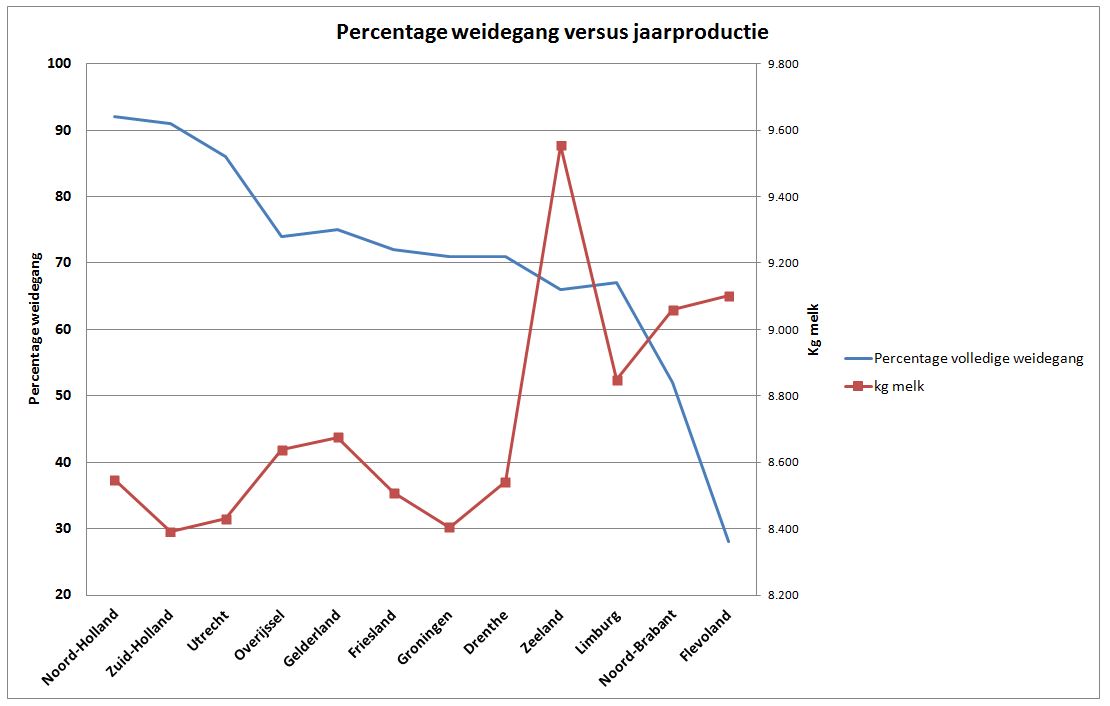 De cijfers illustreren ook dat de productie deels los staat van weidegang. Zo staat Zeeland in de rangorde van provincies op een negende plaats met 66 procent als het gaat om weidegang. Maar gaat in Groningen die qua productie op een een-na-laatste plaats staat maar iets meer koeien de wei. Zuid-Holland komt dan wel weer bijna bovenaan als het gaat om weidegang.