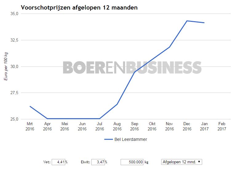 Kaasmaker Bel Leerdammer opent het jaar 2017 op een niveau waar 2016 mee afgesloten werd. Waarmee de melkprijs ruim boven de prijs van een jaar eerder uitkomt.