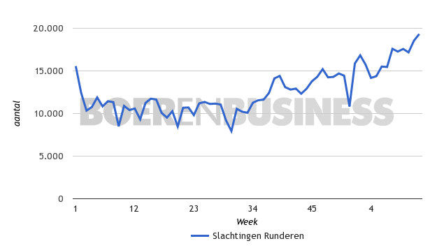 Het slachtcijfer noteerde in week 13 in Nederland 19.331 runderslachtingen. Het gemiddelde gewicht kwam uit op 308,47 kilo. Van de runderen die in Nederland worden geslacht, valt doorgaans 90 procent onder de noemer melkkoe. De overige 10 procent is vleesvee. De reden van de oplopende slachtcijfers is uiteraard de GVE-regeling uit het Fosfaatreductieplan.