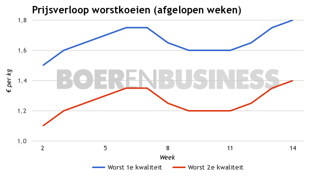 Verbazingwekkend is dat de prijzen van (worst)koeien stijgende zijn in Nederland. Daarbij profiteert Nederland van de aantrekkende vleesprijzen in Europa. Maandag steeg de prijs van worstkoeien (klasse 1) met 5 cent tot 1,65 - 1,95 euro per kilo. Eenzelfde prijsverhoging was zichtbaar voor worstkoeien (klasse 2), die nu 1,15 - 1,65 euro per kilo noteren.