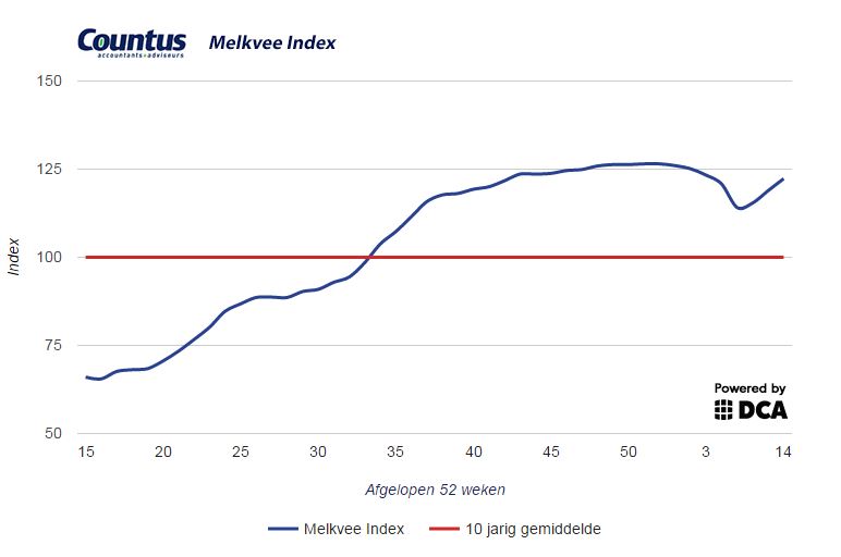 De Countus Melkvee Index zit sinds halverwege februari weer in de lift. De reden hiervoor: licht aantrekkende melkprijzen bij de meeste zuivelaars in februari en maart en stabilisatie in april. De voerprijzen noteren daarentegen wel hoger.