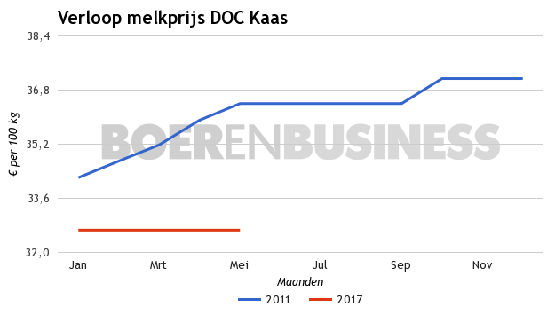 Bij 4,41 procent vet en 3,47 procent eiwit blijft de melkprijs van DOC Kaas voor de vijfde maand op rij staan op 32,66 euro. Dit is bij een jaarleverantie van 600.000 kilo melk. De vetprijs noteert 2,926 euro per kilo, tegen een eiwitprijs van 5,851 euro per kilo. Een jaarleverantie van 800.000 kilo wordt uitbetaald met 32,95 euro. Bij 1,1 miljoen kilo is de melkprijs 33,24 euro.