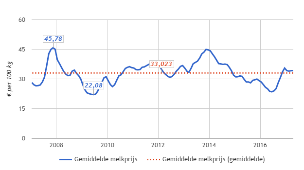 Gemiddelde melkprijs in de periode 2007 tot 2017