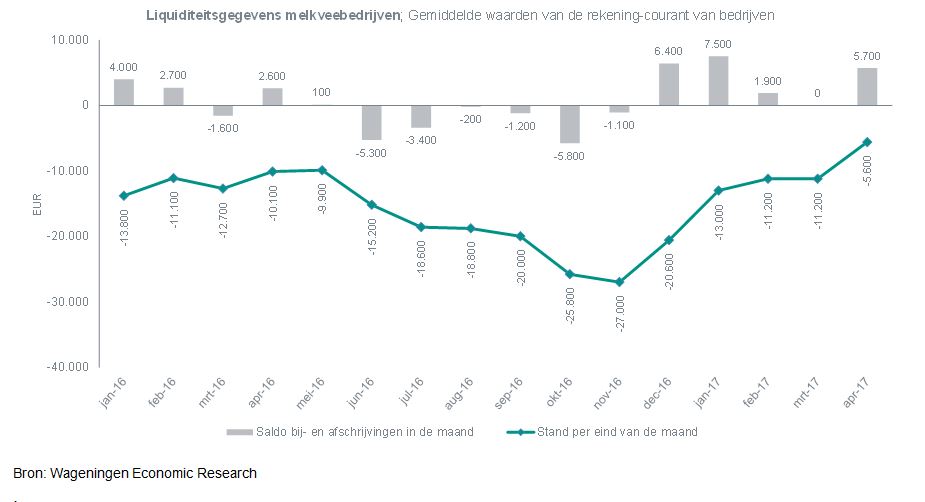 In vergelijking tot het einde van 2016 gaat het beduidend beter in de melkveehouderij. Zo wisten de veehouders een verbetering te behalen van 15.000 euro. Gemiddeld resulteert dit voor april nog wel steeds in een roodstand van 5.600 euro op de rekening-courant. Per melkkoe houdt het een verbetering van 150 euro in.