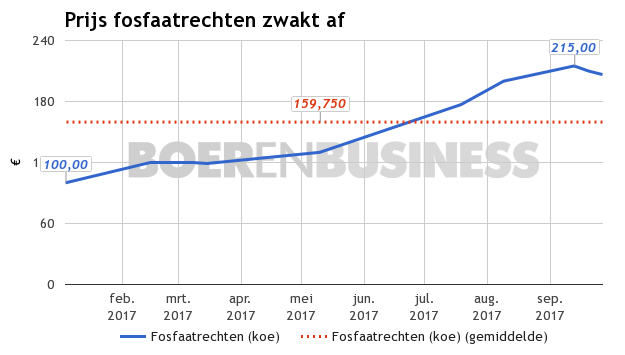 Fosfaatrechten zijn sinds begin september wat in waarde gezakt. Het is een keerpunt in het bestaan van de fosfaatrechten. De prijs van de productierechten steeg sinds het begin van dit jaar fors. Dit jaar startte de handel op €100 en die prijs liep begin september op tot gemiddeld €215 per fosfaatrecht.