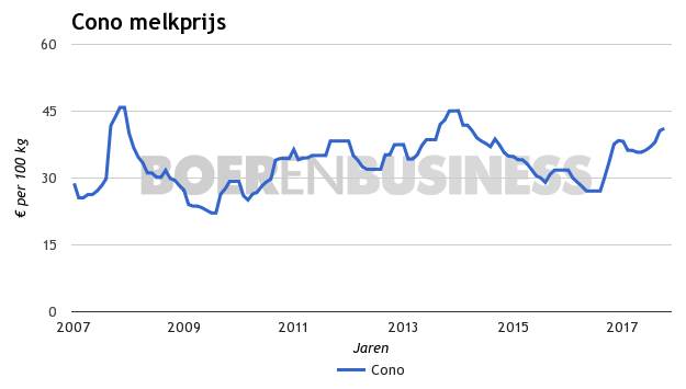 Over oktober zet Cono de waarderingen voor vet en eiwit nog iets omhoog. Zo neemt de prijs per kilo vet toe tot €3,55 en stijgt eiwit naar €7,54 per kilo. Het zijn nog niet de hoge prijzen van 2007 en 2014, maar nog steeds waarderingen die de melkprijs in staat stellen om boven de €40 uit te komen.
