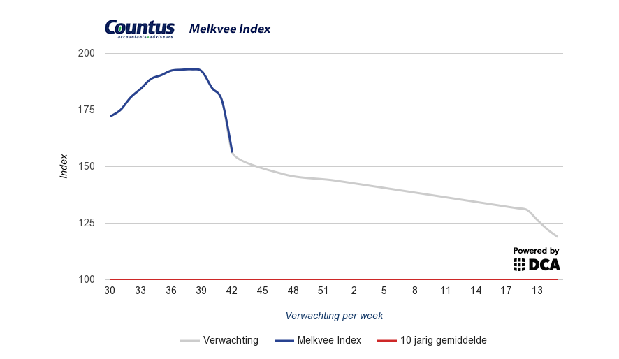 De Melkvee Index is in samenwerking met DCA gemaakt. Voor een lange tijd bleef de Countus Melkvee Index vooral stijgen, maar het tij is nu gekeerd en de daling is ingezet. Daarmee komt de Index uit op 156.2 punten, een daling van 36.1 punten.