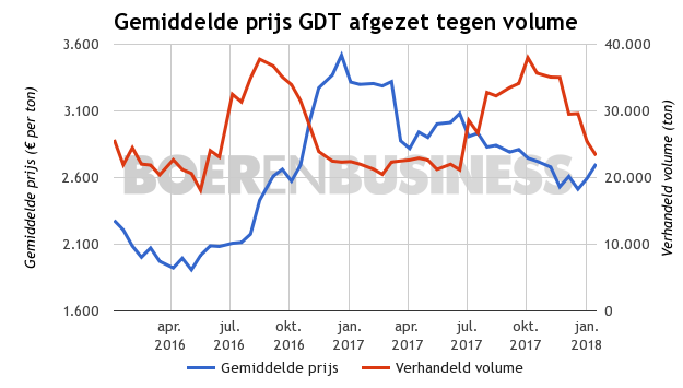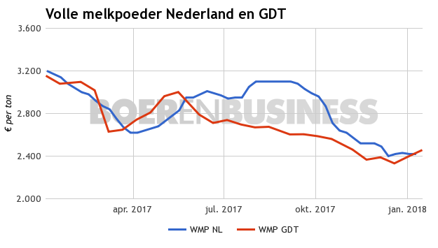 Ondanks het mindere aanbod was de markt er niet van overtuigd dat de prijzen ruimte zouden krijgen om toe te nemen. Nieuw-Zeeland bewijst evenwel nog steeds een belangrijke rol te spelen. De prijs stijgt gemiddeld met 4,9% naar $3.310 per ton. De prijs van volle melkpoeder stijgt zelfs nog feller en komt met een plus van 5,1% uit op $3.010 per ton. Levering maart kent de grootste stijging in prijs. Daarna kan China voor een gunstig tarief zuivel invoeren.