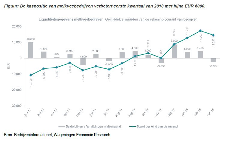 Melkveehouders zagen de stand op de rekening-courant in het eerste kwartaal van 2018 met gemiddeld €6.000 toenemen. Dit levert een gemiddeld bedrag op van €14.500. In vergelijking tot 1 jaar eerder levert het een plus op van €20.000 (omgerekend €200 per melkkoe), zo becijferde ABN Amro. Echter, vergeleken met het laatste kwartaal van 2017 pakt de stijging lager uit.