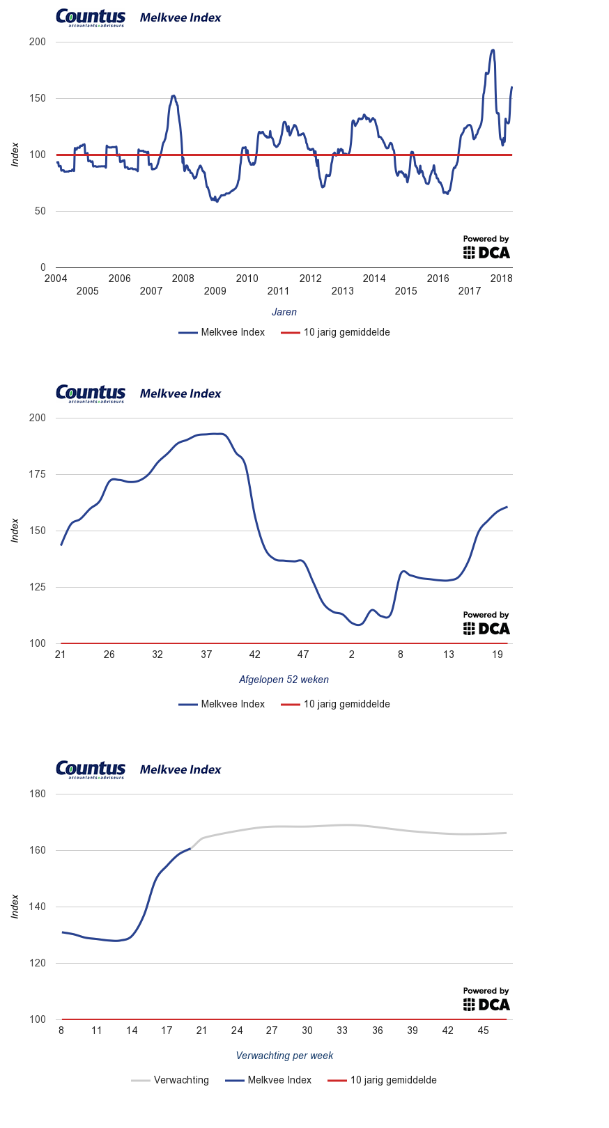 De Countus Melkvee Index, samengesteld met DCA, slaagt erin om tot week 20 een verhoging neer te zetten; van 154,70 punten in week 17 stijgt de Index naar 160,70 punten in week 20. Het 10-jarig gemiddelde geldt als 100. De prognose laat zien dat er nog een klein beetje ruimte naar boven is, maar dat de sector daarna een stabiele periode tegemoet kan zien.