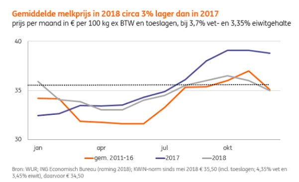 De bank, die maar een klein deel van de melkveehouders vertegenwoordigt, geeft in het vooruitzicht voor de agrarische sector aan wat de koers van de melkprijs wordt, maar meldt tegelijkertijd dat een krimp van veestapel niet wenselijk is. Die krimp wordt genoemd is samenhang met het klimaatvraagstuk. De bank stelt dat de veehouderij verplaatsen naar het buitenland niet de oplossing is. Innovaties op het gebied van voerefficiency, blijvend grasland en rantsoenoplossingen voor koeien bieden meer kansen.De maand oktober zal volgens de ING een daling laten zien.