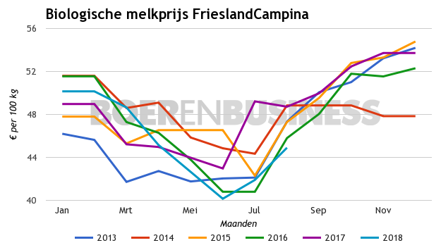Er gaat over augustus €2 van de prijs voor biologische melk af. Van de afwaardering geeft FrieslandCampina aan dat €1,61 het gevolg is van te hoog ingeschatte prijzen over de voorgaande maanden. Het gaat dan om de prijzen van referentiebedrijven, die de basis vormen voor de garantieprijs.