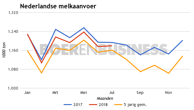 De melkaanvoer bevindt zich iets onder 2017, maar iets boven het 5-jarig gemiddelde.