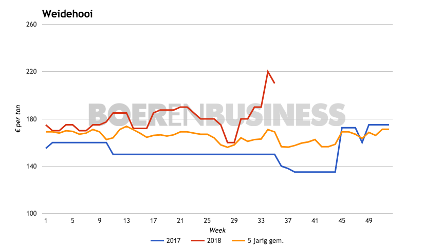 De prijs van weidehooi liet vorige week een behoorlijke prijsstijging zien, maar deze week is die stijging getemperd. De prijs laat zelfs een daling zien. Het maakt dat de prijs uitkomt op €210 per ton franco boerderij, wat echter nog steeds een zeer hoog niveau is.