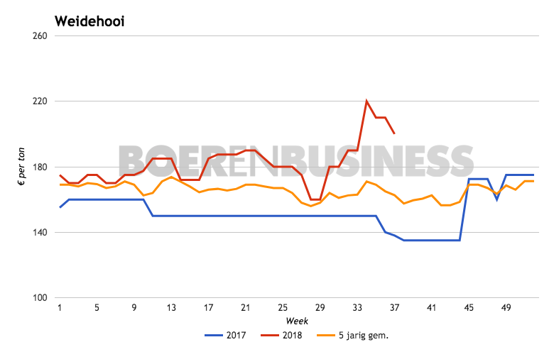 De markt voor weidehooi is gezwicht onder het feit dat er maar weinig handel is. De handelaren meldden vorige week nog dat de markt voor weidehooi een oplopende trend vertoonde, maar niets blijkt minder waar. Deze week zet de prijs dan ook een daling weg, waardoor de prijs naar €200 per ton franco boerderij zakt. Handelaren melden dat dit veroorzaakt wordt doordat er minder vraag is; sommigen melden zelfs dat het product in Nederland sowieso niet heel gewild is.
