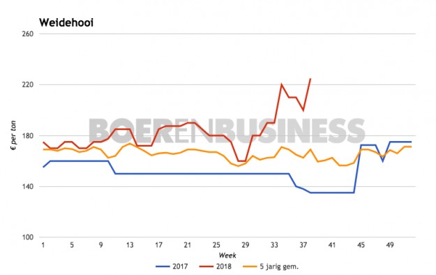 Niet alleen de prijs van stro heeft een fikse stijging weggezet, want ook de prijs van weidehooi schiet naar een torenhoog niveau. De prijs komt deze week uit op €225 per ton franco boerderij, waar dat vorige week nog €200 per ton franco boerderij was. Dit heeft vooral te maken met het feit dat er zeer weinig product beschikbaar is, terwijl de vraag constant blijft.