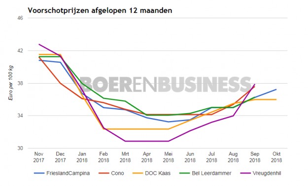 Vreugdenhil laat de vet- en eiwitprijzen over de maand september onveranderd. Dankzij de wintertoeslag laat de melkprijs van de poederproducent echter een flinke stijging zien.