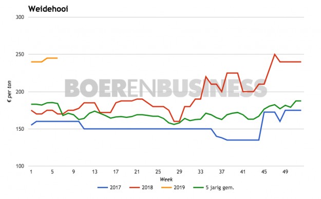 De prijzen blijven deze week gelijk aan vorige week, waardoor stro (zowel tarwe- als gerstestro) op een prijs van €145 per ton franco boerderij staat. Weidehooi blijft staan op een prijs van €245 per ton franco boerderij, wat nog altijd veel hoger is dan in de voorgaande jaren. Snijmaïs blijft staan op €65 per ton franco boerderij.