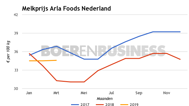 De prijs voor vet komt bij Arla over maart uit op €3,98 per kilo, terwijl het concern voor het eiwit €4,37 per kilo betaald. Dit is voor beide producten €0,01 per kilo meer dan over februari. Bij een jaarleverantie van 800.000 kilo melk komt de melkprijs (bij 4,41% vet en 3,47% eiwit) uit op €34,59 per 100 kilo. Het is een lichte toename van €0,08 per 100 kilo, in vergelijking tot februari.