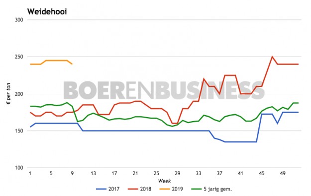 Vorig week werd al duidelijk dat de kans op dalende voerprijzen alsmaar groter wordt en de prijs voor weidehooi lijkt deze week onder de druk gezwicht te zijn. De notering voor het product laat een daling zien (-€5) tot €240 per ton franco boerderij. Al bevindt de prijs zich nog altijd ver boven het 5-jarig gemiddelde, want die komt voor deze periode van het jaar uit op €183 per ton franco boerderij.
