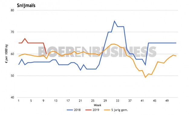 Ook de prijs voor snijmaïs laat deze week een kleine daling zien: -€5 tot €60 per ton franco boerderij. Er is niet per se minder vraag, maar er is steeds minder product van (zeer) goede kwaliteit beschikbaar. Hierdoor laat de gemiddelde prijs een daling zien. Handelaren merken dan ook op dat voor de goede kwaliteit nog altijd een hoge prijs betaald wordt (€70 of meer).