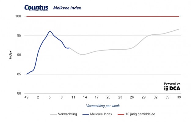 De Countus Melkvee Index noteert halverwege maart 91,8 punten, waarbij 100 punten het langjarig gemiddelde is. Daarmee ligt de score 4,3 punten lager dan in het begin van februari. Vergeleken met de weken rond Kerst, is duidelijk dat het rendement wat is gestegen. In die periode noteerde de Index namelijk 85,6 punten.