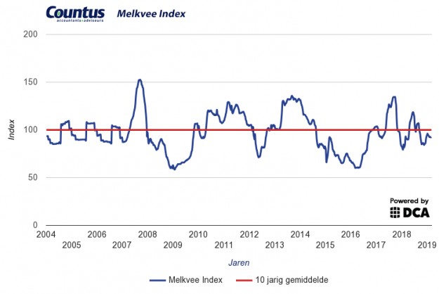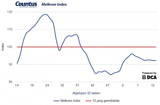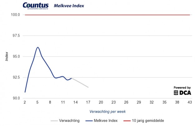 "In de laatste maanden zien we dat de melkprijs bij de meeste bedrijven voldoende was om de kosten te betalen, maar er zijn geen grote buffers opgebouwd", zo meldt Camiel Verhagen, adviseur bij Countus. "Daarnaast zijn afgelopen jaar veel liquide middelen gebruikt om fosfaatrechten aan te kopen." Op basis van de huidige noteringen van de zuivelfabricaten is er geen zicht op hogere melkprijzen. De prognose van de Index toont aan dat het rendement de komende weken gaat dalen.