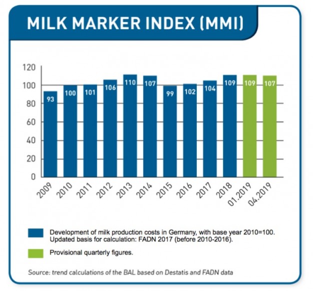 Met de Milk Marker Index (MMI) wordt zichtbaar hoe de melkproductiekosten in Duitsland zich de afgelopen jaren ontwikkeld hebben. In april 2019 bedroeg de MMI 107. Dat betekent dat de productiekosten voor Duitse melkveehouders met 7% zijn gestegen ten opzichte van het basisjaar 2010.