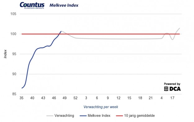 De Countus Melkvee Index heeft over de maand november het 10-jarig gemiddelde gepasseerd. Voor komende weken wordt echter weer een afname verwacht, waarna de Melkvee Index rond tot iets onder het gemiddelde blijft schommelen.