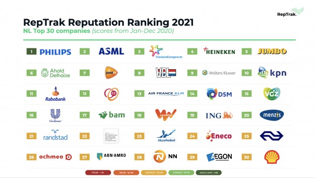 The RepTrak Company doet continu onderzoek onder Nederlanders naar hun perceptie van de 30 grootste bedrijven van Nederland. Hierbij wordt onder meer gekeken naar thema's als het voldoen aan klantverwachtingen, het zinvol bijdragen aan de maatschappij en het tonen van aanpassingsvermogen. "De bedrijven in de top 30 zijn het jaar gestart met een flinke blijk van vertrouwen. De steun en waardering zijn hoog, maar de argumenten om hierin te blijven geloven staan onder druk. De overheid heeft gedurende de crisis het nieuws beheerst, vooral de afgelopen 5 maanden. Bedrijven bleven wat in de luwte", aldus Thomas McNeill, Vice President Benelux van The RepTrak Company.