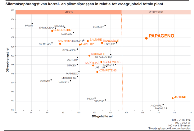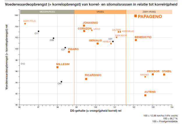 Bij oogst op het juiste moment is de opbrengst van de korrel dominerend, zeer zeker ook bij de oogst van de maïs als silomaïs. Dit komt tot uiting in hoge drogestof- en voederwaardeopbrengsten. Daarnaast is ook de voederwaarde een goede indicator van de kwaliteit van PAPAGENO. Niet voor niets dat PAPAGENO in het zeer vroege segment (FAO 200) een aanbeveling heeft gekregen op de Officiële Rassenlijsten in Nederland en België! PAPAGENO kan zeer zeker rijp geoogst worden voor 1 oktober in de hele Benelux, wat tevens maakt dat er daarna met succes Snelle Lente Rogge op hetzelfde perceel geteeld kan worden. PAPAGENO geeft samen met Snelle Lente Rogge de hoogste drogestof-, eiwit- en zetmeelopbrengst per hectare!