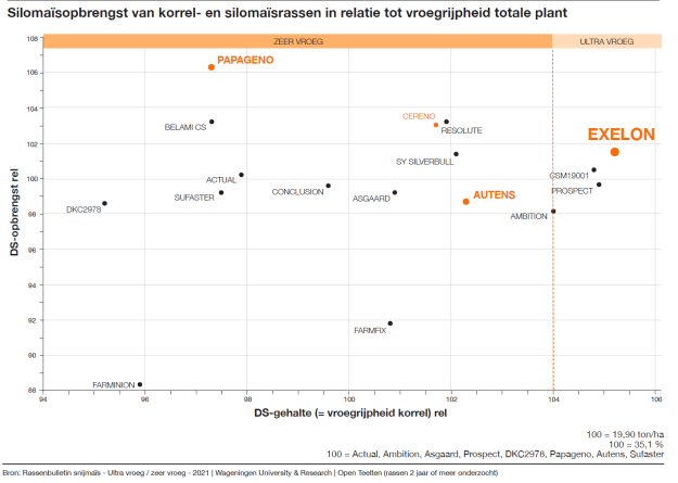 In de resultaten zoals gepresenteerd in de eerste grafiek, staat om reden van vroegrijpheid en opbrengst de korrelopbrengst van maïsrassen voor zowel korrelmaïs- als silomaïsdoeleinden centraal. Uit de proeven in deze grafieken is werkelijke vroegrijpheid en opbrengst vastgesteld. Daaruit blijkt dan ook dat sommige maïsrassen, die in de praktijk als 'vroeg' worden verkocht, in werkelijkheid helemaal niet zo vroeg zijn. Met deze rassen wordt dan ook niet het optimale saldo uit een rijpe korrel behaald. Ook hier geldt weer dat het goed is om daar als teler alert op te zijn. Zeker wanneer er later dan gepland gezaaid moet worden als gevolg van de lagere temperaturen dan normaal in april!