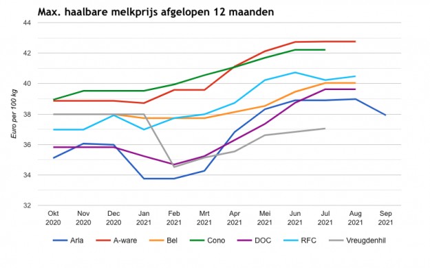 Arla Foods communiceert zelf een melkprijs voor september van €35,55 per 100 kilo melk bij 4,2% vet en 3,4% eiwit, inclusief premies voor kwaliteit, VLOG en klimaat. Ten opzichte van het voorschot voor augustus is dit een daling van €1,05 per 100 kilo. Dit is direct de eerste prijsdaling bij Arla sinds december 2020. Het gehele jaar 2021 is de melkprijs stabiel gebleven of gestegen. De neerwaartse correctie lijkt een gevolg te zijn van de onder druk staande zuivelmarkt in de tweede helft juli en de eerste weken van augustus. Pas de afgelopen 2 weken trekken de DCA-zuivelnoteringen zichtbaar aan.