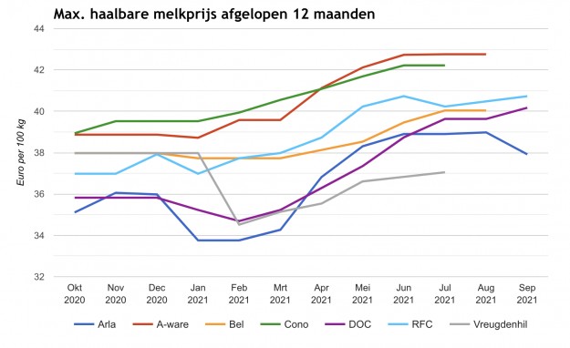 Bij de maximale melkprijs, oftewel de prijs inclusief alle mogelijke toeslagen en inhoudingen, zijn de rollen echter omgedraaid. DOC Kaas komt ook met de maximale melkprijs voor het eerst boven de 40 euro: €40,17 per 100 kilo, eveneens een plus van €0,54 ten opzichte van de maand ervoor. Dat is echter wel €0,56 per 100 kilo lager dan de maximale melkprijs van FrieslandCampina. Daarbij moeten de maximale melkprijzen van A-ware en CONO voor september nog worden bekendgemaakt. Deze zuivelconcerns staan al heel het jaar bovenaan qua maximale uitbetaling.