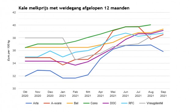 De gemiddelde kale melkprijs van de 6 grootste Nederlandse verwerkers is in augustus met 35 cent per 100 kilo gestegen ten opzicht van juli. De melkprijs inclusief weidegang steeg met slechts 2 cent per 100 kilo