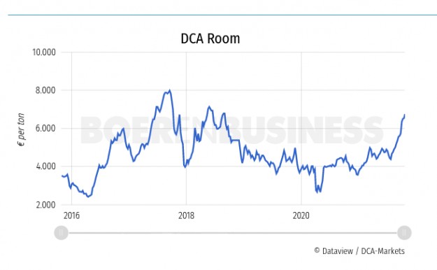 Bij room en magere melkconcentraat waren de prijsstijgingen iets bescheidener,maar de roomprijs nadert langzaam maar zeker de €7000 per ton. Deze week kwam er volgens de DCA-notering €215 bij de prijs op en werd uiteindelijk €6800 genoteerd. Tot het recordniveau van €8000 per ton in eind 20117 is het nog wel even te gaan, en wellicht gaat de prijs nu ook niet zó ver omhoog.