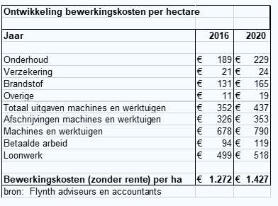 De totale bewerkingskosten per bij Flynth geregistreerd bedrijf zijn in afgelopen vijf jaar gestegen van gemiddeld bijna €67.000 naar €82.000 per jaar, wat neerkomt op een stijging van 23%. Een deel van deze stijging wordt verklaard door uitbreiding van het aantal melkkoeien (+9 stuks) en vergroting van het bedrijfsareaal (+5 hectare). Deze schaalvergroting woog evenwel niet op tegen de stijging van de bewerkingskosten per hectare en per kilogram melk.