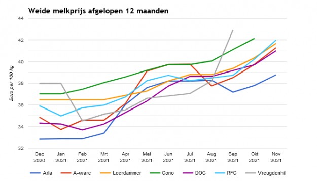 FrieslandCampina verhoogde de melkprijs voor november het sterkst, met €1,75 per 100 kilo. Arla deed de meest bescheiden stap met een verhoging van €0,98 per 100 kilo.